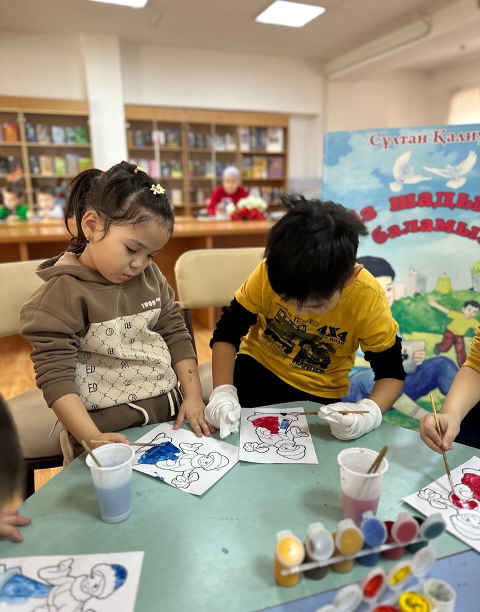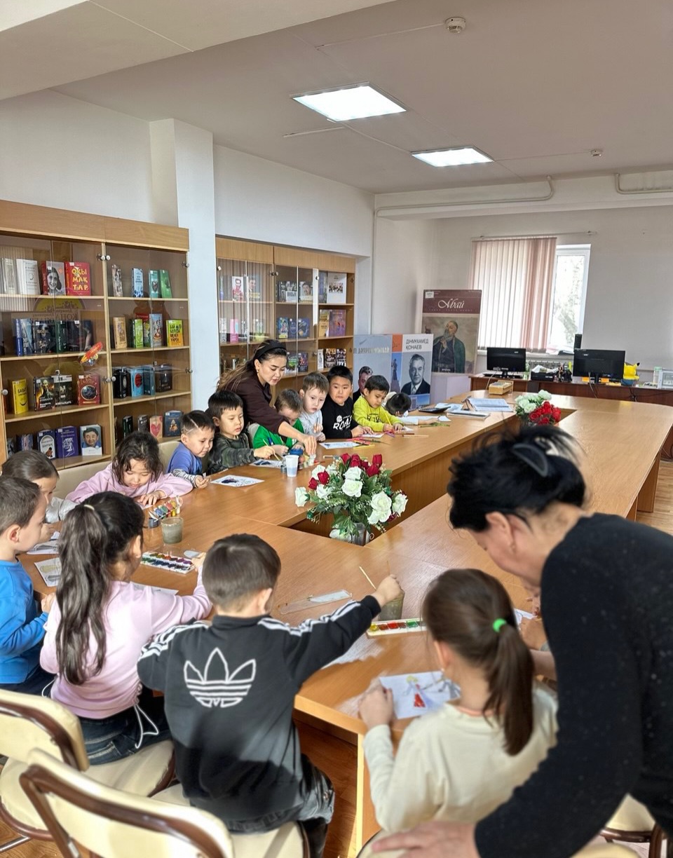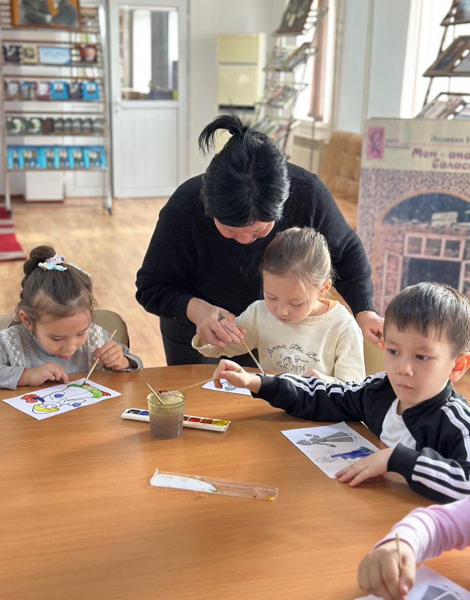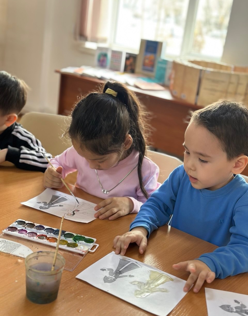 Түрлі-түсті акварельмен жұмыс жасау мақсатында «Шабыт» балалар клубының тұрақты оқырмандары сурет салып үйренді.